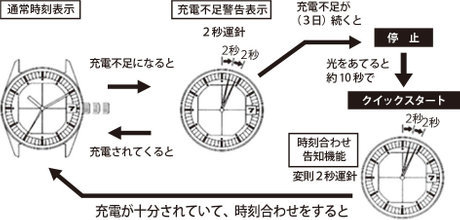 一度時計が停止した後、再び光を当てると、クイックスタート機能が働き時計は動きだしますが、時刻が狂っていることを知らせます。このような場合は十分に充電して時刻を合わせ直してください。時刻合わせ操作をしないと変則2秒運針が続きます。
