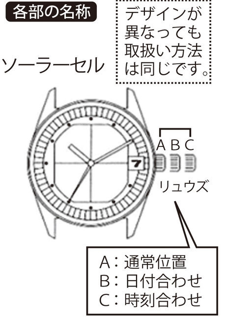 (3)時報(TEL117)等に合わせてリュウズをきちんと通常位置Aに戻します。