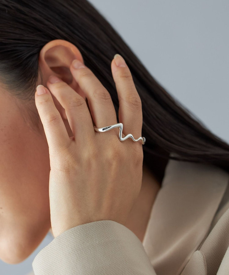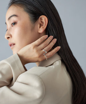 シンプルで軽やかな装いにこそ映える、有機的でアーティーなデザイン。