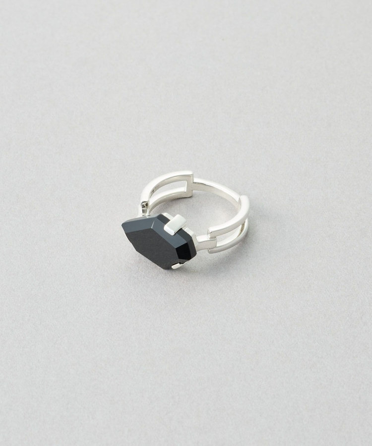 個性的な変形六角形カットに、無骨さを感じさせる爪留めやアームのデザインが相まってハンサムな佇まいに。