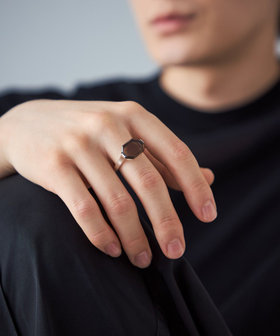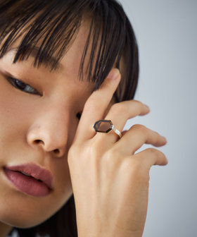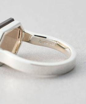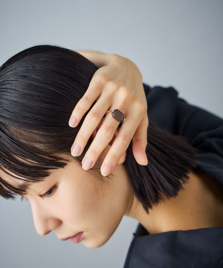 八角形のストーンの2ヶ所をプレート爪で留めた、潔くミニマルなデザイン。