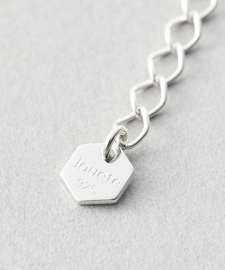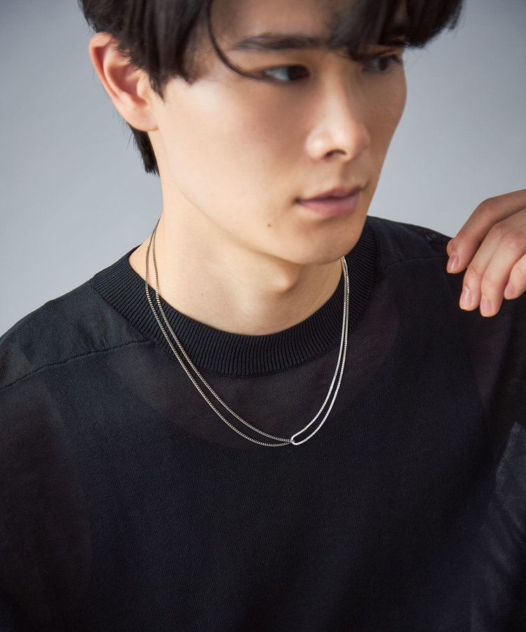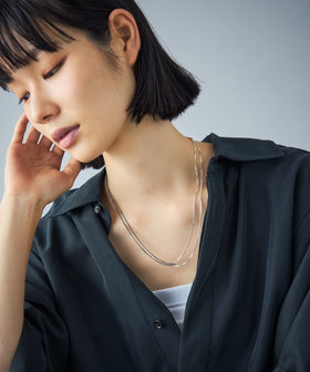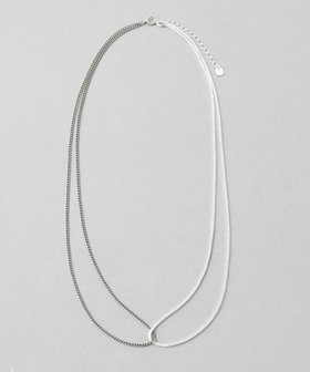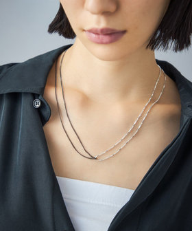 カラーもデザインも異なるチェーンが、お互いを引き立てあうネックレス。
