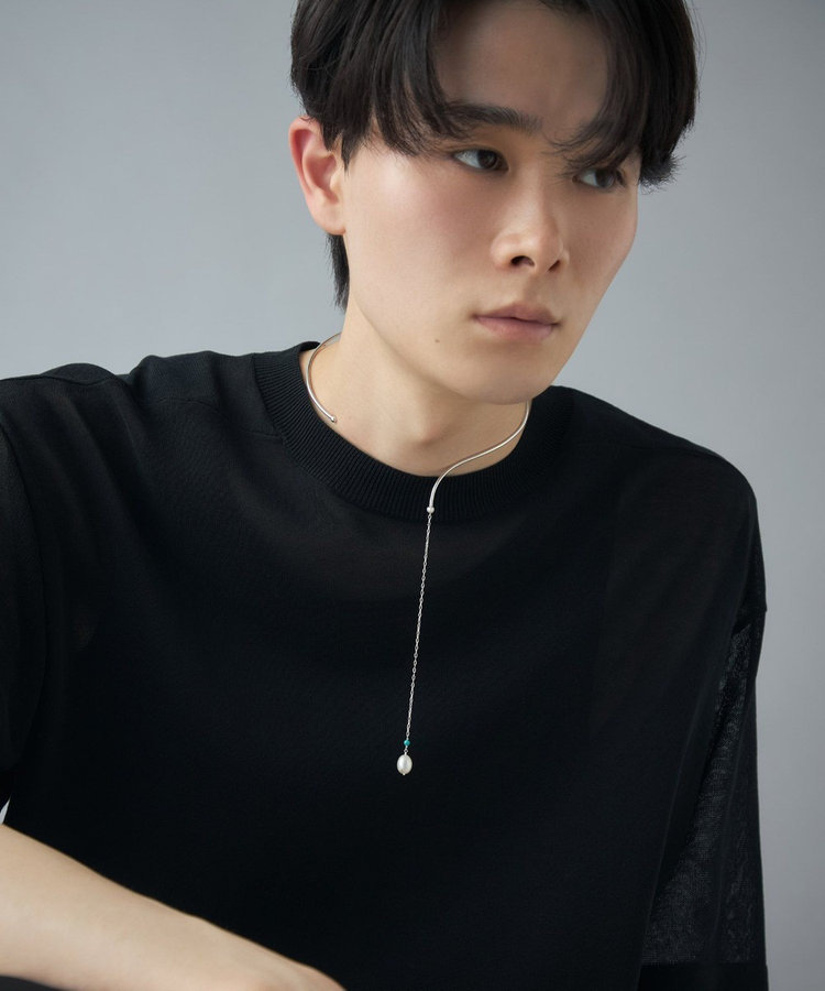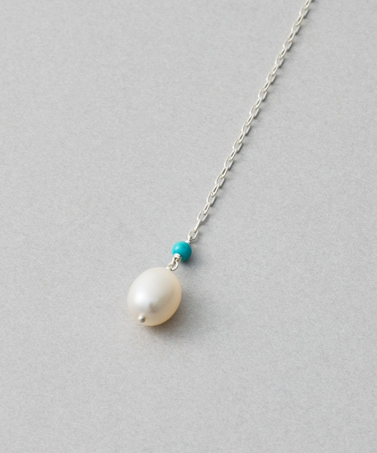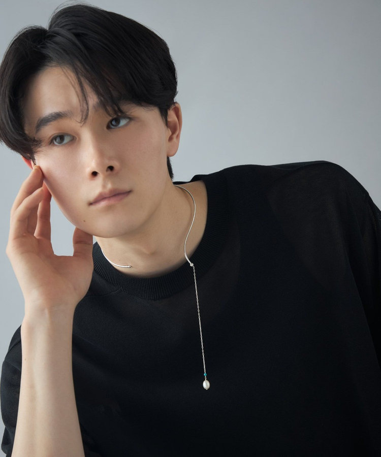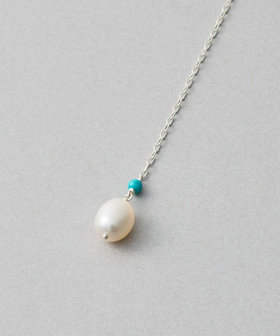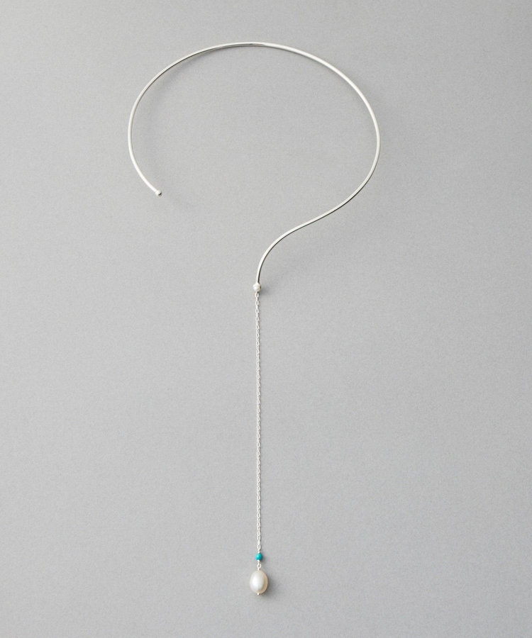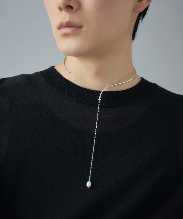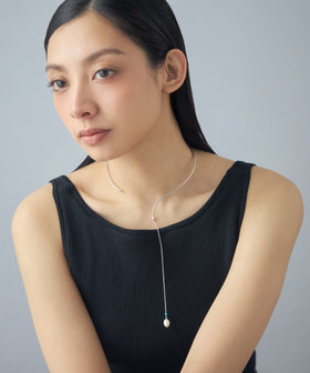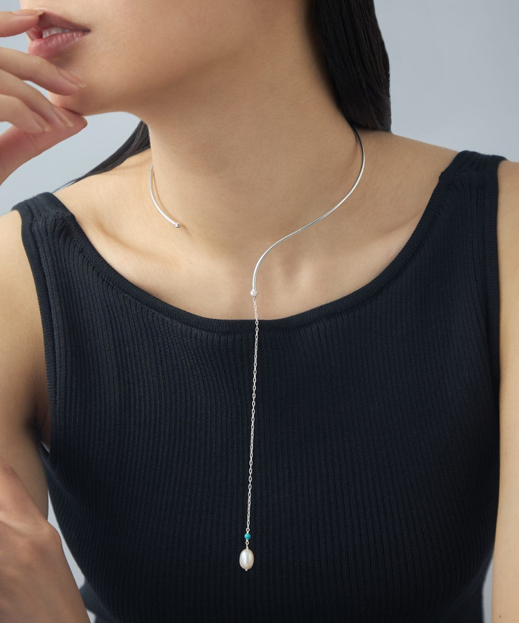 地金の先から伸びるチェーンとパールが、水の流れのようになめらかに身体に寄り添います。