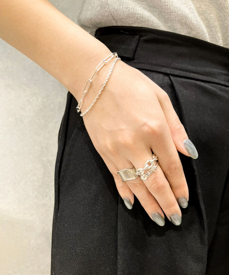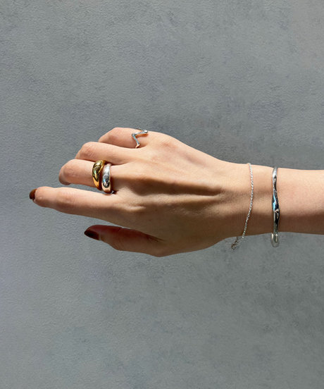 3連風のレイヤードデザインはボリュームリングを1本だけあわせて、潔くも洗練された手元に。
